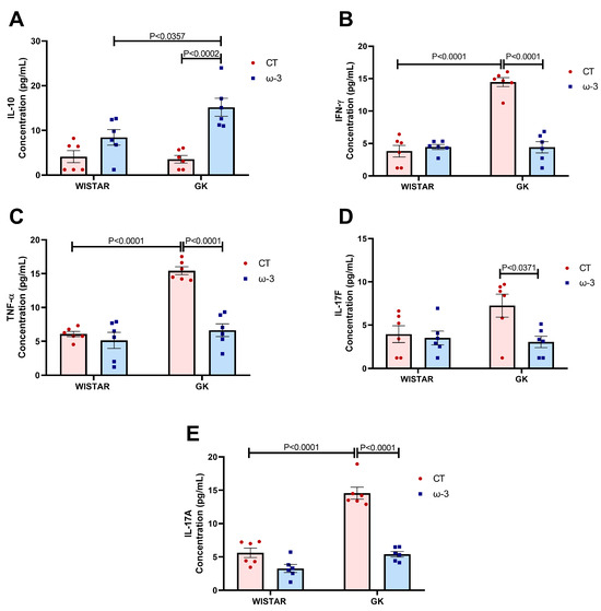 Cytokine concentrations in the supernatant of the T lymphocyte cultures in the presence of PMA and ionomycin. (A) IL-10, (B) IFN-γ, (C) TNF-α, (D) IL-17F, and (E) IL-17A concentrations. Wistar CT, (n = 6); Wistar ω-3, (n = 6); GK CT, (n = 6); and GK ω-3, (n = 6). The results are expressed as the means ± standard errors of the means (SEM). CT, control; GK, Goto-Kakizaki; PMA, 12 h with phorbol myristate acetate; IL, interleukin; TNF-α, tumor necrosis factor-α; IFN-γ, interferon-γ.