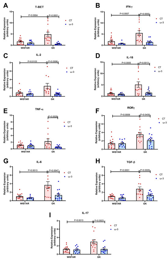 Concerning the expression of genes encoding proteins associated with the inflammatory profile of Th1 cells, we observed that the GK control group exhibited an increased expression of the transcription factor T-bet (Figure 8A), as well as IFN-γ (Figure 8B), IL-18 (Figure 8D), and IL-2 (Figure 8C) genes compared to the WT control group. Upon ω-3 supplementation, the expression of these genes was reduced in the GK group compared to the control. The expression of the TNF-α gene (Figure 8E) was reduced in the GK ω-3 group compared to the GK control group. When assessing the gene expression of the Th17 (inflammatory) profile, the GK control group demonstrated an enhanced expression of the transcription factor ROR-γ (Figure 8F), as well as IL-6 (Figure 8G), TGF-β (Figure 8H), and IL-17 (Figure 8I), when compared to the WT control group. FO supplementation suppressed the expression of these genes in the GK group compared to GK CT.