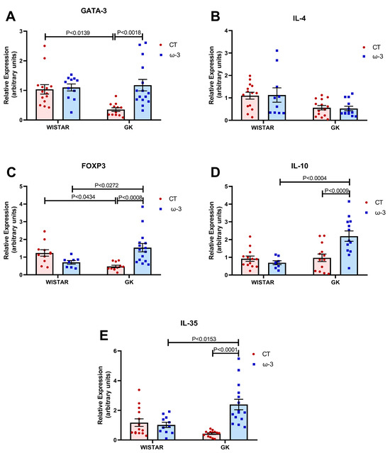 The expression of genes related to the Th2 lymphocyte profile was also assessed. An elevation in the expression of the transcription factor GATA-3 was identified in the GK ω-3 group compared to the GK control (Figure 9A). No significant difference was observed for IL-4, a cytokine released by these cells, between the groups (Figure 9B). Regarding genes associated with the Treg profile, FOXP3 expression (Figure 9C) was lower in the GK control group compared to the WT control animals. FO supplementation enhanced its expression in the GK group, with levels higher than those reported in the WT ω-3 group. Although IL-10 (Figure 9D) and IL-35 (Figure 9E) expression in the GK control group did not vary from that in the WT control group, FO supplementation markedly elevated the expression of these cytokines in the GK group compared to the GK control.