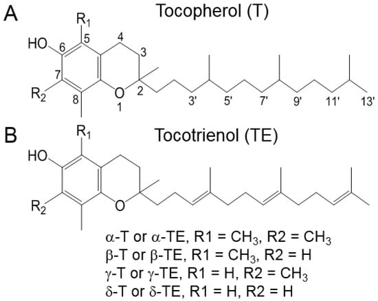 Vitamin E is a crucial nutrient and a well-known lipophilic chain-breaking antioxidant. In 1922, Evans and Bishop first identified vitamin E as an essential dietary factor for reproduction in rats [1]. Since this discovery, numerous studies have focused on the potential health benefits of vitamin E for various diseases. Natural forms of vitamin E consist of eight structurally related compounds, which can be further categorized into two main groups: tocopherols and tocotrienols. Both tocopherols and tocotrienols share the same basic chemical structure, characterized by a 16-carbon phytyl chain attached to the 2-position of a chromane ring. The primary difference between the two is that tocopherols have a saturated phytyl chain, while tocotrienols feature an unsaturated phytyl chain with three double bonds. The individual tocopherols and tocotrienols—namely α-, β-, γ-, and δ-tocopherol (αT, βT, γT, and δT) and α-, β-, γ-, and δ-tocotrienol (αTE, βTE, γTE, and δTE)—differ from each other based on the number and position of methyl groups on the chromane ring. The structures of tocopherols and tocotrienols are shown in Figure 1.