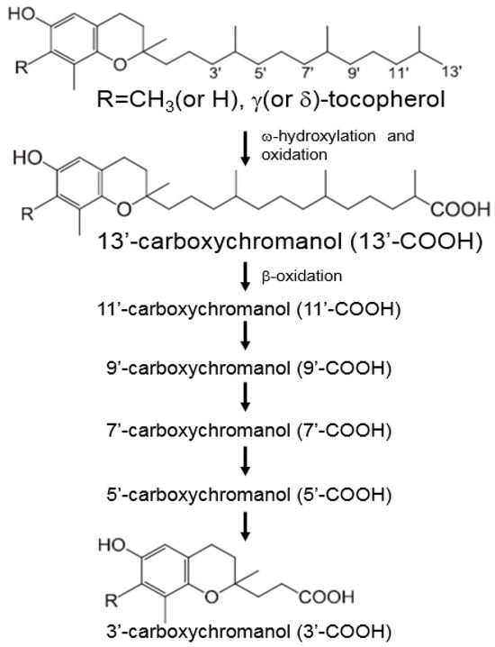 In contrast, α-TTP has much lower affinity for other forms of vitamin E. As a result, non-αT forms of vitamin E such as β-, γ-, δ-T and α-, β-, γ-, δ-TE are relatively low in tissues, as they are preferentially catabolized in the liver via cytochrome P450 (CYP4F2)-mediated ω-hydroxylation to 13′-hydroxychromanol (13′-OH). 13′-OH is then further oxidized to 13′-carboxychromanol (13′-COOH), followed by β-oxidation of the phytyl chain to generate various shorter chain-length carboxychromanols, including 11′- and 9′-COOHs, and the terminal product 3′-COOH or (2′-carboxyethyl)-6-hydroxychromans (CEHCs). CEHCs are the water-soluble metabolites of vitamin E and are primarily excreted out of the body via the urine (Figure 2) [8,11,12]. In parallel with β-oxidation, conjugation reactions such as sulfation and glucuronidation of the phenolic group on the chromane ring occur in the intermediate metabolites when the intake of vitamin E forms is high [13]. Therefore, despite γT being the major form of vitamin E in the US diet, αT is the predominant form of vitamin E in the body. The plasma concentrations of αT are about 20~30 μM, but γT is 5–10 times lower than αT in the plasma [7,14]. Additionally, the bioavailability of γT is suppressed by increased intake of αT [15], but γT supplementation has been shown to increase the levels of both tocopherols [16].