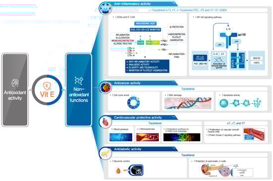 Besides antioxidant activities of vitamin E, vitamin E isoforms have other biological functions independent of their antioxidant properties such as anti-inflammatory, anticancer, cardioprotective, and antidiabetic effects (Figure 3). Chronic inflammation has been recognized as contributing to the development of other chronic diseases including cardiovascular diseases and cancer [24,25]. Eicosanoids derived from arachidonic acid via cyclooxygenases (COX) and 5-lipoxygenase (LOX)-catalyzed reactions play important roles in the regulation of inflammation and cancer [26,27]. Mechanistic studies have shown that vitamin E forms such as γT, δT, and γTE exert anti-inflammatory activities by inhibiting COXs and 5-LOX activities and suppressing nuclear factor κB (NF-κB) and Janus kinase (JAK)-signal transducer and activator of transcription (STAT) 6 or JAK-STAT3 signaling pathways in various types of cells [8,22,28,29]. In particular, novel mechanisms of the anti-inflammatory effects of γTE have been discovered, in which γTE inhibits TNFα-stimulated NF-κB, TAK1 and JNK activation by modulating sphingolipids and inducing ER stress, followed by the up-regulation of A20 [30]. In addition, δT-13′-COOH, a long-chain carboxychromanol from δT, has been demonstrated to competitively inhibit COX-1 and -2 activities, exhibiting much stronger effects than short-chain carboxychromanols and unmetabolized vitamin E forms [31]. δT-13′-COOH also inhibited 5-LOX activity [32], indicating that δT-13′-COOH is a unique dual inhibitor of COX-1/COX-2 and 5-LOX. In addition to the anti-inflammatory activities of vitamin E forms, αT, γT, and δT have been demonstrated to prevent the development of atherosclerosis by inhibiting protein kinase C activity and the proliferation of smooth muscle cell [33,34]. Several studies have shown that the plasma concentrations and the intake of γT are inversely associated with increased risk of cardiovascular disease (CVD), suggesting that γT is important in the defense against CVD [35]. Moreover, tocotrienols have been shown to have cardioprotective effects, which may stem from their blood-pressure-lowering, cholesterol-lowering, and antiatherogenic effects [22]. In the cholesterol-lowering activities of tocotrienols, tocotrienols affect the mevalonate pathway by post-transcriptionally suppressing the 3-hydroxyl-3-methyl-glutaryl CoA reductase [36].