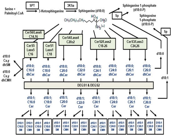 The de novo sphingolipid biosynthesis (Figure 4 and Figure 5) begins in the endoplasmic reticulum, where serine and palmitoyl-CoA are condensed by serine palmitoyltransferase (SPT) to form 3-keto-dihydrosphingosine, which is reduced to dhSph. This is followed by acylation by dihydroceramide synthase (CerS), which generate dhCer. Finally, dihydroceramide desaturase (DEGS) introduces a 4,5-trans double bond to convert dhCer into Cer [88].