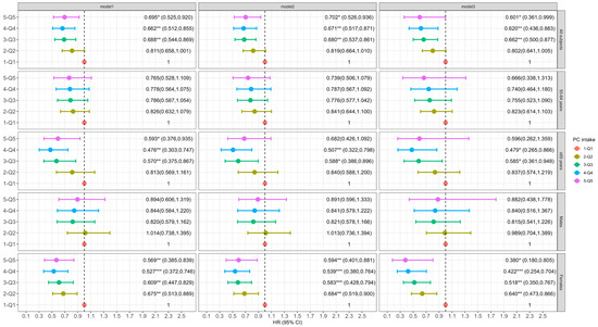 Among males, dietary choline intake in both Q2 and Q3 was associated with a 31.9% (95% CI: 0.489, 0.949) and 34.5% (95% CI: 0.462, 0.929) lower risk of cognitive decline relative to Q1 in Model 3 (p-trend = 0.8662, Figure 1). No significant association was found for dietary PC intake (p-trend = 0.6954 for Model 3, Figure 2). For dietary GPC, intake in Q2 was associated with a 39.8% (95% CI: 0.425, 0.852) reduction in the risk of cognitive decline compared to Q1 after full adjustment (Figure 3), and a marginally significant association was found in Q4 (HR: 0.711, 95% CI: 0.482, 1.048, p-trend = 0.8082).