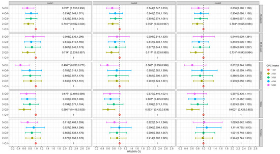 In females, both dietary choline and PC intakes in the Q2–Q5 groups were associated with a reduced risk of cognitive decline in each model (Figure 1 and Figure 2), but no significant trends across quintiles of choline intake (p-trend = 0.1033) or PC (p-trend = 0.5491) were observed in Model 3. However, dietary GPC intake did not significantly affect the risk of cognitive decline in females (p-trend = 0.1525 for Model 3, Figure 3).
