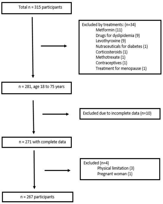 Persons over 18 years of age, healthy or with comorbidities, were included, with an initial number of 315 persons recruited. Those who consumed drugs for the treatment of dyslipidemias, metformin, levothyroxine, nutraceuticals for the treatment of various non-communicable diseases, corticosteroids, methotrexate, hormones for the treatment of menopause, or contraceptives were excluded. Also, those who presented incomplete data in the records of biochemical and anthropometric data, who did not fully complete the questionnaires, who showed the presence of any physical limitation, and pregnant women were excluded. Finally, 267 participants remained for data analysis, as summarized in Figure 1.