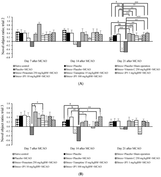 Novel object ratio (NOR) of various groups over a 21-day experimental period after an operation. (A) Novel object ratio (trial 2); (B) novel object ratio (trial 3). Data are presented as the mean ± SEM (n = 6/group). a p value < 0.05 when compared to the naïve control group, b, bb p value < 0.05 and 0.01, respectively, when compared to the stress + placebo-treated group, cc, ccc p value < 0.01 and 0.001, respectively, when compared to the stress + placebo + sham operation-treated group, ##, ### p value < 0.01 and 0.001, respectively, when compared to the placebo + MCAO-treated group, *, **, *** p value < 0.05, 0.01, and 0.001, respectively, when compared to the stress + placebo + MCAO-treated group.