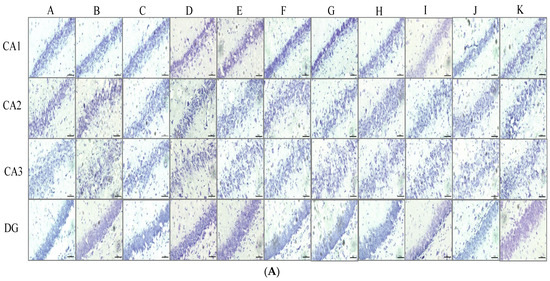 The current data show that no significant changes in neuron density in CA1, CA2, CA3, and DG of hippocampus were observed in the stress + placebo-treated group or the stress + placebo + sham operation-treated group. These data suggest that stress, placebo, and sham operation did not decrease neuron density in any areas of the hippocampus. Placebo + MCAO slightly decreased neuron density in CA1 and DG areas, but no significant change was observed. The decrease in neuron density in the placebo + MCAO-treated group suggested that MCAO may induce a slight neurodegeneration, and because of the small sample size and a variation, no significant change was observed. Stress + placebo + MCAO significantly decreased neuron density in CA1 (p-value < 0.001 compared to the naïve control group, p-value < 0.001 compared to the stress + placebo + sham operation-treated group) and DG (p-value < 0.001 compared to the naïve control group, p-value < 0.001 compared to the stress + placebo-treated group, p-value < 0.001 compared to the stress + placebo + sham operation-treated group). When compared to placebo + MCAO, it was found that stress + placebo + MCAO significantly decreased neuron density in DG (p-value < 0.01). Vitamin C and tianeptine produced a significant mitigation effect on the reduction in neuron density in CA1 and DG (p-value < 0.01 all, and p-value < 0.001 all compared to the stress + placebo + MCAO-treated group), whereas piracetam significantly mitigated the reduction in neuron density only in the DG of rats subjected to stress exposure and MCAO (p-value < 0.001 compared to the stress + placebo + MCAO-treated group). A low dose of JP1 mitigated the reduction in neuron density only in DG (p-value < 0.001 compared to the stress + placebo + MCAO-treated group), while the medium and high doses of JP1 significant increased neuron density in CA1 and DG (p-value < 0.01 all, and p-value < 0.001 all compared to the stress + placebo + MCAO-treated group), as shown in Figure 3A,B.