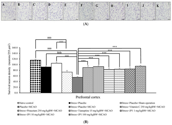 The density of survival neurons in the prefrontal cortex of various treatment groups. (A) Representative pictures of the survival neurons density in the prefrontal cortex. (B) Quantitative data on the survival neurons density in the prefrontal cortex. Data are presented as the mean ± SEM (n = 6/group). aaa p value < 0.001 when compared to the naïve control group, bbb p value < 0.001 when compared to the stress + placebo-treated group, ccc p value < 0.001 when compared to the stress + placebo + sham operation-treated group, *** p value < 0.001 when compared to the stress + placebo + MCAO-treated group-treated group. Magnification 40× (scale bar = 50 μM). (A) The naïve control group, (B) the stress + placebo-treated group, (C) the stress + placebo + sham operation-treated group, (D) the placebo + MCAO-treated group, (E) the stress + placebo + MCAO-treated group, (F) the stress + vitamin C 250 mg/kg BW + MCAO-treated group, (G) the stress + piracetam 250 mg/kg BW + MCAO-treated group, (H) the stress + tianeptine 15 mg/kg BW + MCAO-treated group, (I) the stress + JP1 1 mg/kg BW + MCAO-treated group, (J) the stress + JP1 10 mg/kg BW + MCAO-treated group, (K) the stress + JP1 100 mg/kg BW + MCAO-treated group.