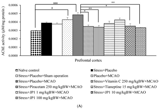 AChE activity in the hippocampus was also assessed, and results are shown in Figure 6B. When compared to the naïve control group, stress + vehicle, stress + vehicle + sham operation, and placebo + MCAO did not produce significant changes in AChE in the aforementioned area. The placebo + MCAO-treated group showed significantly increased AChE in the hippocampus (p-value < 0.001 compared to the naïve control group, p-value < 0.001 compared to the stress + placebo-treated group, p-value < 0.001 compared to the stress + placebo + sham operation-treated group). It was also found that stress-exposed rats that received placebo and were subjected to MCAO showed significantly increased AChE activity (p-value < 0.001 compared to the naïve control group, p-value < 0.001 compared to the stress + placebo-treated group, p-value < 0.001 compared to the stress + placebo + sham operation-treated group). An elevation in AChE activity in stress-exposed rats subjected to MCAO was mitigated by vitamin C, piracetam, tianeptine, and JP1 at the doses of 10 and 100 mg/kg BW (p-value < 0.001 all compared to the stress + vehicle + MCAO-treated group).