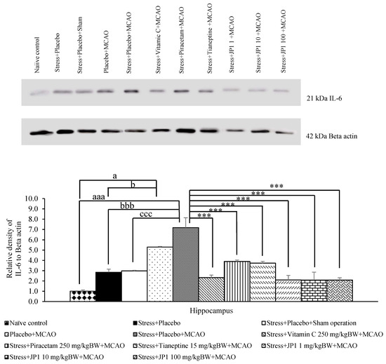 Our results revealed marked changes in spatial memory, so we further explored the changes in inflammatory mediators such as IL-6, TNF-α, and caspase 3 in the hippocampus, an area with an important role in spatial memory. In addition, the mentioned markers were previously determined in our previous work. Figure 7 demonstrated that when compared to the naïve control group and stress + placebo, stress + placebo + sham operation produced no significant change in IL-6 in the hippocampus. Placebo + MCAO-treated rats also showed increased IL-6 (p-value < 0.05 compared to naïve control, p-value < 0.05 compared to the stress + placebo-treated group). The stress + placebo + MCAO-treated group produced a significant elevation in IL-6 in the mentioned area (p-value < 0.001 compared to the naïve control group, p-value < 0.001 compared to the stress + placebo-treated group, p-value < 0.001 compared to the stress + placebo + sham operation-treated group). These results suggest that stress, placebo, and sham operation produced no significant change in IL-6. MCAO produced a significant elevation in IL-6. This elevation was attenuated by vitamin C, piracetam, tianeptine, and all doses of JP1 in this study (p-value < 0.001 all compared to the stress + placebo + MCAO-treated group).