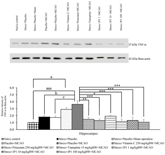 It was found that the stress + placebo and stress + placebo + sham operation produced no change in TNF-α in the hippocampus, as shown in Figure 8. Placebo + MCAO-treated rats showed significantly increased TNF-α in this area (p-value < 0.05 compared to the naïve control group). Stress-exposed rats that received placebo and were subjected to MCAO produced a significant elevation in TNF-α (p-value < 0.001 compared to the naïve control group, p-value < 0.05 compared to the stress + placebo-treated group, p-value < 0.05 compared to the stress + placebo + sham operation-treated group). However, this change was mitigated by vitamin C, piracetam, tianeptine, and JP1 at the doses of 1, 10, and 100 mg/kg BW (p-value < 0.001, 0.001, 0.05, 0.001, 0.001, and 0.001, respectively, compared to the stress + placebo + MCAO-treated group).