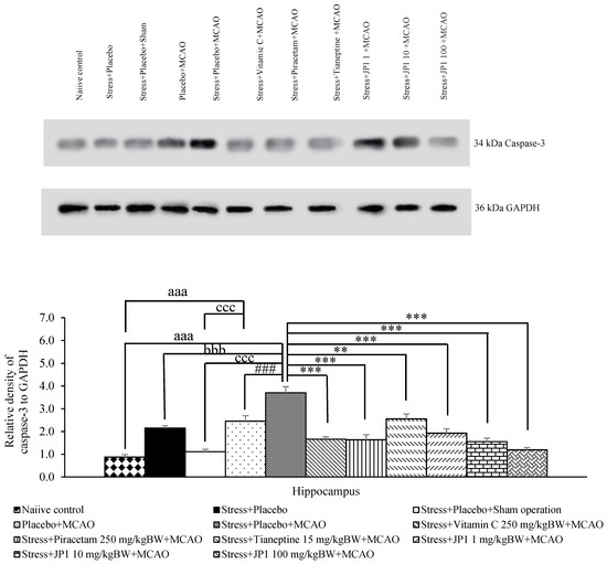 Effect of various treatments on the expression of caspase-3 in the hippocampus. Data are presented as mean ± SEM (n = 6/group). aaa p value < 0.001 when compared to the control group, bbb p value < 0.001 when compared to stress + placebo, ccc p value < 0.001 when compared to stress + placebo + sham operation, ### p value < 0.001 when compared to placebo + MCAO, **, *** p value < 0.01 and 0.001, respectively, when compared to stress + placebo + MCAO.