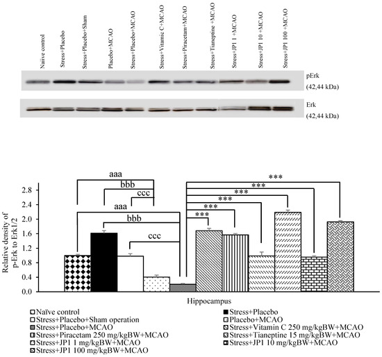 Owing to the role of Erk signaling pathway in learning and memory [35], the effect of JP1 on the mentioned pathway in the hippocampus was also explored. No significant change in this signal pathway was observed in the stress + placebo-treated group or the stress + placebo + sham operation-treated group. Placebo + MCAO-treated rats showed significantly reduced pErK1/Erk1/2 in the hippocampal region (p-value < 0.001 compared to the naïve control group, p-value < 0.001 compared to the stress + placebo-treated group, p-value < 0.001 compared to the stress + placebo + sham operation-treated group). Stress-exposed rats that received placebo and were subjected to MCAO produced a significant reduction in the mentioned parameter (p-value < 0.001 compared to the naïve control group, p-value < 0.001 compared to the stress + placebo-treated group, p-value < 0.001 compared to the stress + placebo + sham operation-treated group). However, this change was attenuated by vitamin C, piracetam, tianeptine, and all doses of JP1 used in this study (p-value < 0.001 all compared to the stress + placebo + MCAO-treated group), as shown in Figure 10.