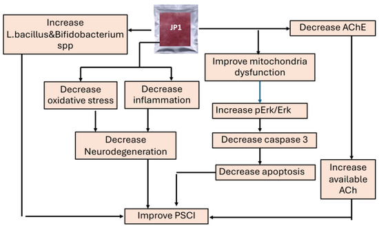 This study demonstrates the cognitive-enhancing effect of JP1, a rice-derived orodispersion film loaded with silkworm hydrolysate and the combined extract of ginger and holy basil. It improves oxidative stress, inflammation, apoptosis, the Erk signaling pathway, and the cholinergic function in a combined stress and stroke condition as summarized in Figure 12. JP1 also decreases serum stress hormones such as corticosterone. Therefore, it may provide beneficial effects against stress-related disorders. However, the precise active ingredient and the mechanism of action require further investigation to provide better understanding.