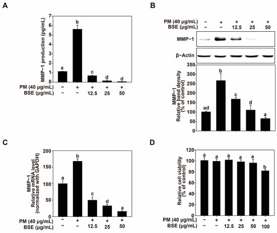 Effects of BSE on PM-induced MMP-1 production and expression. (A) Influence of BSE on MMP-1 production in HaCaT cells. HaCaT cells were pretreated with varying concentrations of BSE for 1 h prior to PM exposure (40 μg/mL). After 24 h, culture media was collected, and MMP-1 levels were quantified using ELISA kits following the protocol in the Materials and Methods section. (B) Influence of BSE on MMP-1 expression in HaCaT cells. Cells were pretreated with specified concentrations of BSE for 1 h before PM exposure (40 μg/mL). Following a 24 h incubation, cells were lysed as outlined in Materials and Methods, and MMP-1 protein levels were assessed via Western blotting. β-Actin was used as a loading control. Images were analyzed using the FUSION Solo S system (VILBER Lourmat, Paris, France). (C) Effect of BSE on MMP-1 mRNA levels in HaCaT cells. Quantitative real-time PCR was used to assess MMP-1 mRNA expression following 1 h pretreatment with BSE at specified concentrations and 6 h PM exposure (40 μg/mL). Cells were lysed according to the Materials and Methods. Data (n = 3) are presented as mean ± SD. (D) Impact of BSE on HaCaT cell viability. Cell viability was evaluated using the MTT assay 24 h after pretreatment with BSE at indicated concentrations and PM exposure (40 μg/mL). Data (n = 5) are shown as mean ± SD. Different letters (a–d) on the graph indicate statistically significant differences (p < 0.05) determined by one-way ANOVA, with Duncan’s Multiple Range test as a post hoc test.
