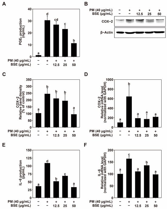 Effects of BSE on PM-induced COX-2 and IL-6 production and expression. (A) Influence of BSE on PGE2 production in HaCaT cells. HaCaT cells were pretreated with various concentrations of BSE for 1 h before PM exposure (40 μg/mL). Following 24 h, culture media was collected, and PGE2 production was measured using enzyme immunoassay kits as detailed in the Materials and Methods. (B,C) Influence of BSE on COX-2 expression in HaCaT cells. Cells were pretreated with the indicated concentrations of BSE for 1 h prior to PM exposure (40 μg/mL). After 24 h, cells were lysed as per the protocol, and COX-2 protein levels were analyzed by Western blotting. β-Actin was used as a loading control. The FUSION Solo S imaging system (VILBER Lourmat, Paris, France) was used for measurements. (D) Effect of BSE on COX-2 mRNA levels in HaCaT cells. Quantitative real-time PCR was employed to assess COX-2 mRNA levels following 1 h BSE pretreatment and 6 h PM exposure (40 μg/mL). Cells were lysed as described in the Materials and Methods. (E) Effect of BSE on IL-6 production in HaCaT cells. Cells were pretreated with BSE for 1 h before exposure to PM (40 μg/mL), and after 24 h, IL-6 levels in the culture media were quantified using ELISA kits as per the protocol. (F) Influence of BSE on IL-6 mRNA expression in HaCaT cells. Quantitative real-time PCR was used to assess IL-6 mRNA levels after 1 h BSE pretreatment and 6 h PM exposure (40 μg/mL). Data (n = 3) are shown as mean ± SD. Means with different letters (a–d) indicate significant differences (p < 0.05), determined by one-way ANOVA, with Duncan’s Multiple Range test as the post hoc test.