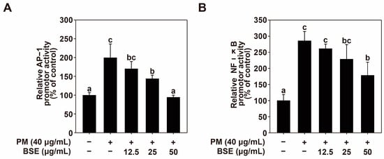 2.3. BSE Inhibits PM-Induced AP-1 and NF-κB Activity