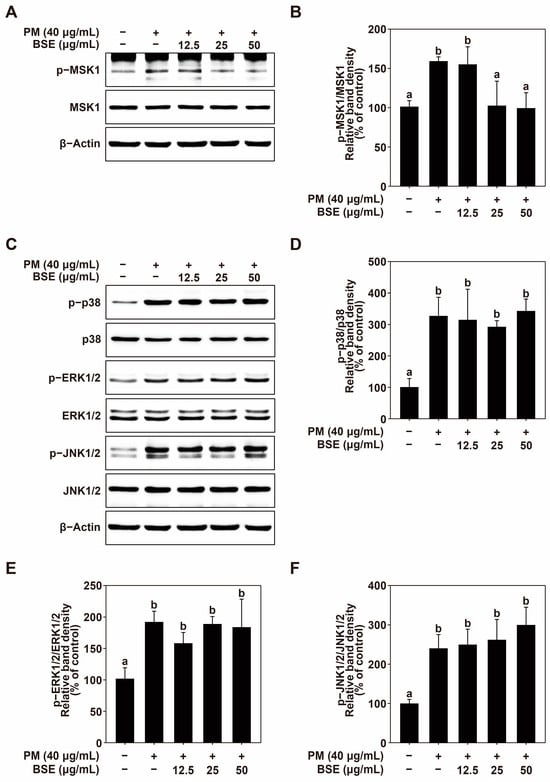 The MAPK signaling pathway is well known to regulate the activity of AP-1 and NF-κB [,]. Therefore, the effect of BSE on PM-induced phosphorylation of MAP kinases was investigated. BSE treatment effectively inhibited MSK1/2 phosphorylation in HaCaT cells (Figure 4A,B). However, BSE did not suppress the phosphorylation of p38 and ERK1/2 (Figure 4C–E) that are upstream of MSK1/2, nor did it inhibit the phosphorylation of JNK1/2 (Figure 4C,F).