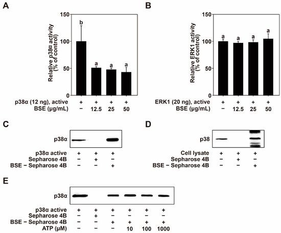 Effects of BSE on p38 MAPK activity via direct binding. (A) BSE inhibits p38α activity. (B) BSE does not inhibit ERK1 activity. Kinase activity was measured as outlined in the Materials and Methods section. (C) Interaction between BSE and active p38α. Binding of BSE to p38α was confirmed by Western blot analysis using an anti-p38α antibody: Lane 1 (input control) contains 10 ng of p38α, serving as a protein standard. Lane 2 (control) contains Sepharose 4B beads. Lane 3 shows the p38α protein pulled down by BSE conjugated to Sepharose 4B beads. (D) Binding of BSE to p38 in HaCaT cell lysate. Western blotting, using an anti-p38 antibody, confirmed the binding: Lane 1 (input control) contains 0.5 µg of HaCaT cell lysate as a protein standard. Lane 2 (control) contains Sepharose 4B beads. Lane 3 indicates that p38 was pulled down by BSE–Sepharose 4B beads. (E) BSE does not compete with ATP for binding to p38α. Lane 1 (input control) includes 10 ng of p38α, used as a protein standard. Lane 2 (control) contains Sepharose 4B beads. Lane 3 shows p38α pulled down by BSE–Sepharose 4B beads, while Lanes 4-6 demonstrate active p38α pulled down by BSE–Sepharose 4B beads in the presence of ATP at concentrations of 10, 100, and 1000 µM. The means with letters (a,b) on the graph indicate a significant difference (p < 0.05) according to one-way ANOVA, and Duncan’s Multiple Range test was used as a post hoc test.