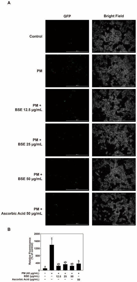 Effect of BSE on PM-induced ROS production. (A,B) Images and quantification of PM-induced ROS reduction by BSE were determined using a DCF-DA fluorescence assay. Data (n = 3) are expressed as the mean ± SD. Different letters (a–c) on the graph indicate significant differences (p < 0.05), as determined by one-way ANOVA followed by Duncan’s Multiple Range Test for post hoc analysis.