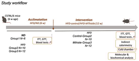 A total of 28 C57BL/6HsdOla male mice of 6 weeks of age were randomly allocated into three different groups: Group 1—normal-diet control group (ND-control) (N = 6); Group 2—high-fat-diet control group (HFD-control) (N = 10); and Group 3—high-fat-diet Mthistle group (HFD-Mthistle) (N = 12). The randomization sequence was generated using a random number table to ensure unbiased allocation. To minimize potential confounders, we standardized the experimental conditions by conducting all treatments and measurements at the same time of day.