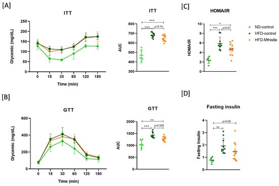 Effect of Mthistle treatment on glycemia. Graphical representation of the average glucose levels for each experimental group, HFD-control, HFD-Mthistle, and ND, at different times (A) for insulin tolerance test (ITT) and the corresponding area under the curve (AUC), and (B) for the glucose tolerance test (GTT) and the corresponding AUC. (C) Insulin resistance index (HOMA-IR) and (D) fasting insulin levels. Graphs represent the mean ± standard deviation of 6–12 animals per experimental group (ND: N = 6; HFD-Control: N = 10; HFD-Mthistle: N = 11). * p < 0.05; ** p < 0.01; *** p < 0.001.