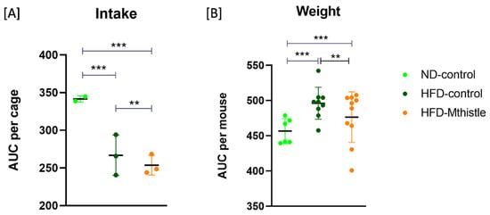 Intake and weight variation of each study group. (A) Area under the curve (AUC) of food intake per cage, and (B) weight variation per mouse in ND (N = 6), HFD-control (N = 9), and HFD-Mthistle (N = 10). Graphs represent the mean ± standard deviation per experimental group. ** p < 0.01; *** p < 0.001.