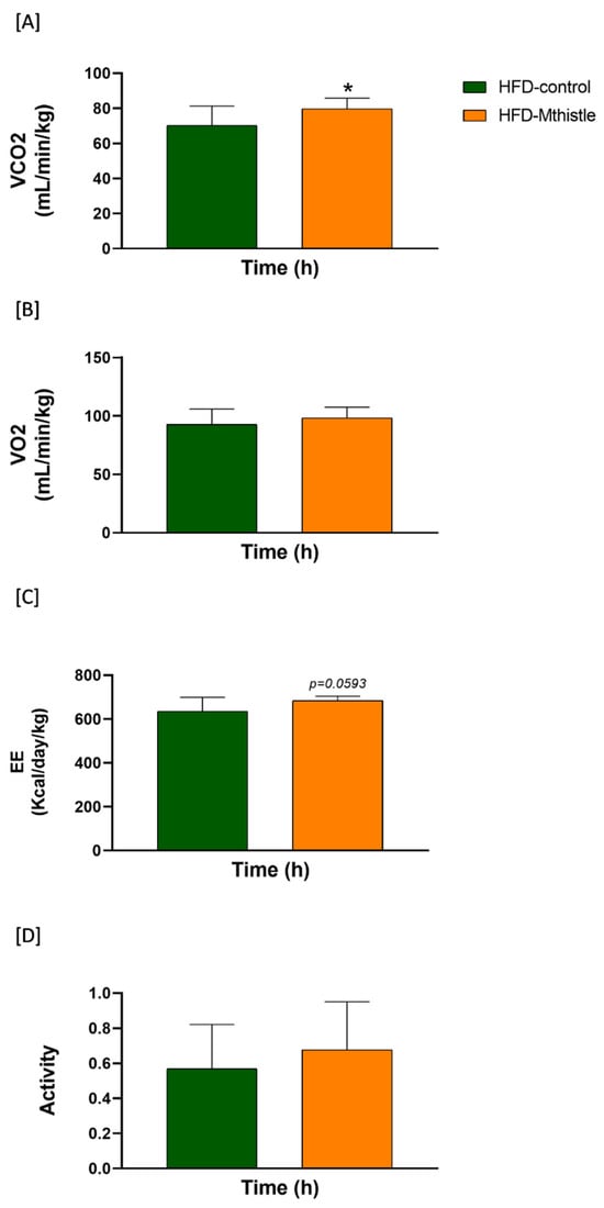 Graphical representation of the variables measured by indirect calorimetry in metabolic chambers for HFD-control and HFD-Mthistle. Values recorded on the third day for the volume of oxygen (VO2) (A), volume of carbon dioxide (VCO2) (B), energy expenditure (EE) (C), and activity (D) are represented. Graphs represent the mean ± standard deviation of 8 mice per experimental group, as the metabolic chambers can accommodate only 8 animals per chamber. * p < 0.05.