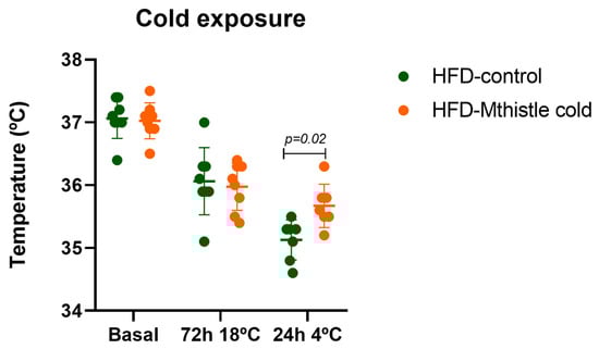 For this purpose, after an acclimatation period of 72 h at 18 °C, animals were maintained at 4 °C for 24 h. As shown in Figure 5, Mthistle helped to preserve body temperature compared to the HFD-control group. It is important to note that in both groups, body temperature was drastically reduced within the first hours of cold exposure, making it very difficult to reverse this thermal change in such a short period (24 h of extreme cold) with Mthistle treatment alone. However, HFD-Mthistle showed a significant improvement in temperature compared to HFD-control (p-value 0.02).
