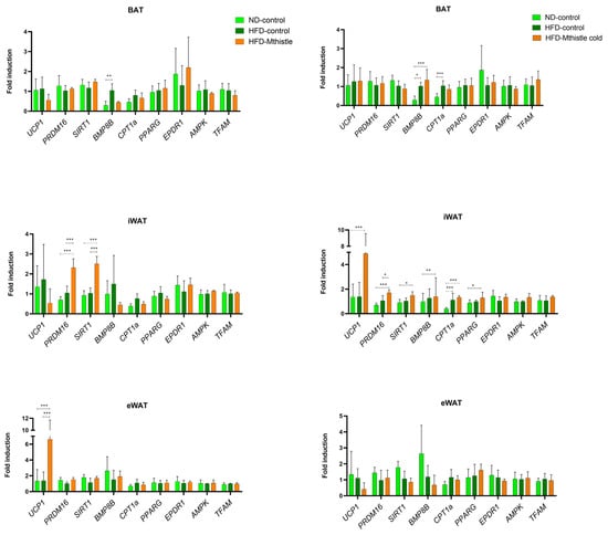 Gene expression levels of targets related to thermogenesis were measured in different types of adipose tissues—brown (BAT), inguinal white (iWAT), and epididymal white (eWAT)—across ND (N = 4), HFD control (N = 6), and HFD-Mthistle (N = 6) with and without exposure to cold stress. Graphs represent the average of the normalized expression levels relative to the ND group ± SEM per experimental group. * p < 0.05; ** p < 0.01; *** p < 0.001.