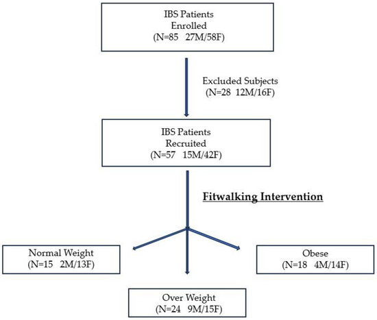 Bianco, A.; Russo, F.; Prospero, L.; Riezzo, G.; Franco, I.; D’Attoma, B.; Ignazzi, A.; Verrelli, N.; Bagnato, C.B.; Goscilo, F.; et al. Beyond Nutritional Treatment: Effects of Fitwalking on Physical Capacity and Intestinal Barrier Integrity in BMI-Stratified IBS Patients. Nutrients 2024, 16, 4181. https://doi.org/10.3390/nu16234181
