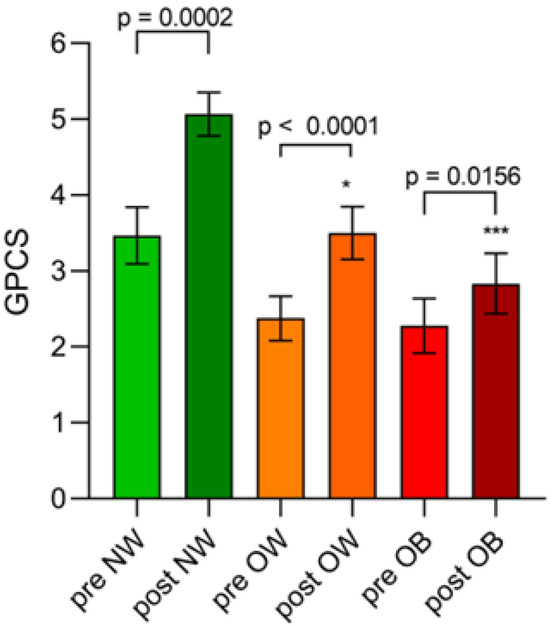 | Post | 77.66 ± 1.72 a | 89.81 ± 1.57 b* | 106 ± 2.32 c | <0.0001 | |