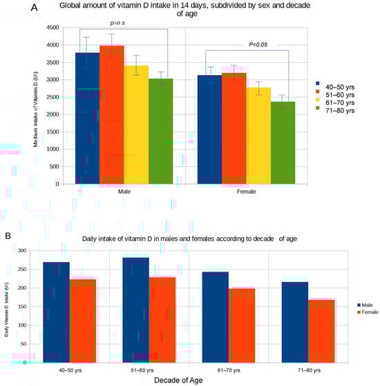 Global amount of vitamin D intake in 14 days (A) and mean daily intake of vitamin D in males and females according to age (B).