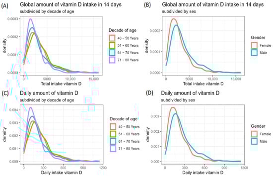 Distribution of global vitamin D intake in 14 days (A,B) and daily vitamin D intake (C,D) subdivided by decade of age and sex.