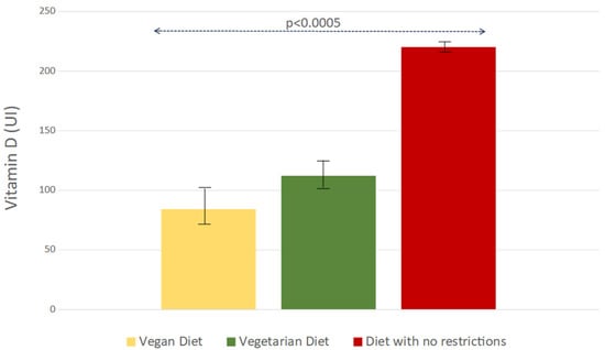 As shown in Table 4, the greatest contribution of vitamin D intake during the 14 days of the survey was supplied by fish, which was found to be remarkably higher than that provided by milk, yogurt, cheese, and meat all together. The overall daily quantity of vitamin D intake was lower in the 595 subjects with one or more comorbidity than in the 275 individuals apparently in good health: 70.8 μg (±1.8 SE [2832 IU ± 73.5 SE]) and 85.5 μg (±1.9 SE [3419 IU ± 77.8 SE]), respectively (p < 0.001). The lowest consumption of vitamin D occurred in patients with osteoporosis (66.6 μg ± 1.7 SE [2666 IU ± 71 SE]) or with oncological disorders (66.3 μg ± 1.7 SE [2653 IU ± 71 SE]). Moreover, as shown in Figure 4, the mean dietary vitamin D consumption was lower in vegan and vegetarian subjects than in patients without any particular dietary regimen: 2.1 μg (±0.7 SE) [84 IU ± 31 SE] vs. 2.8 μg (±0.6 SE) [112 IU ± 23 SE] vs. 5.5 μg (±0.1 SE) [220 IU ± 5 SE] (p < 0.0005).