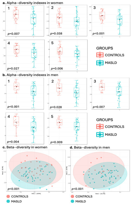 Alpha-diversity index comparison between the control and MASLD groups in (a) women and (b) men. The indexes shown are as follows: 1. Observed; 2. Shannon; 3. Chao1; 4. Fisher; 5. ACE. Beta-diversity comparison between control and MASLD groups in (c) women and (d) men.