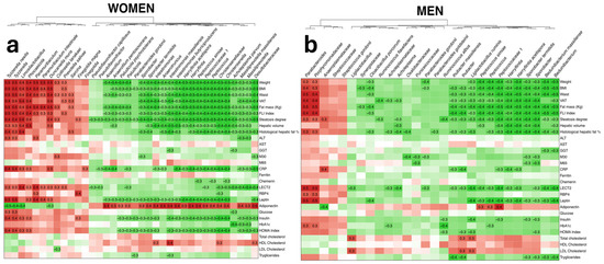 MASLD individuals generally possessed measurements suggesting a worse metabolic and hepatic status, glucose metabolism and inflammatory state. In men, transaminases, M65, CRP and chemerin did not differ between groups. In women, the AST, GGT, M65, ferritin and LDL cholesterol levels did not differ between the controls and MASLD volunteers (Table 1). Moreover, some evaluated parameters significantly differed in men and women when comparing the controls and MASLD groups. Specifically, the control group showed significant differences in weight, waist, FLI index, hepatic volume, transaminases, ferritin, RBP4, leptin, adiponectin and HDL-c levels between men and women. Furthermore, in the MASLD group, there were differences in weight, waist, visceral adipose tissue (VAT), FLI index, hepatic volume, transaminases, ferritin, RBP4, leptin, glycated hemoglobin, HDL-c and triglyceride levels between men and women (Table 1).