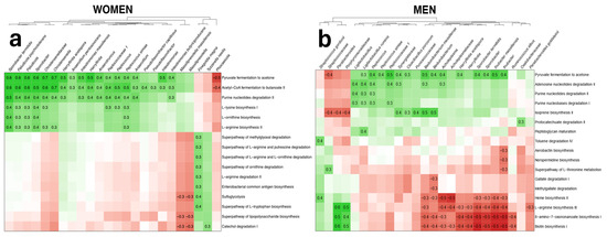 Associations between bacterial features and altered metabolic pathways in (a) women and (b) men. Negative associations are presented in red and positive associations are presented in green. The intensity of the color represents the degree of the associations, with a higher Rho marked as more intense. Significant associations with q-values less than 0.05 are marked with their corresponding Rho values.