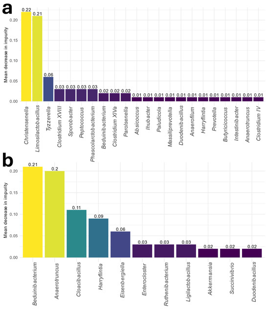 Men had 11 taxa responsible for up to 80% of the classification obtained from the RF model into MASLD or control groups (Figure 4b). Among these taxa, the Beduinibacterium and Anaerotruncus genera had classification capacities of more than 40%. Beduinibacterium was a genus found in the differential abundance analysis and was depleted in MASLD individuals. On the other hand, Anaerotruncus’s abundance was enhanced.