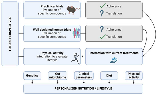 Overview of future perspectives. A major issue associated with dietary interventions is adherence to the diet. Therefore, preclinical in vivo trials can aid in evaluating the effects of specific diets and nutrients. Other approaches include well-designed human trials in which diets and nutrients are evaluated, as well as capsules that can be derived from and/or contain beneficial or existing compounds. In addition, the interaction of dietary interventions or nutrients with existing treatments and those in development should be investigated. Finally, the effects of physical activity should also be integrated in future work. The integration of genetic factors, the gut microbiome, clinical parameters, diet, and physical activity using machine learning techniques will lead to personalized nutrition or lifestyle advice in both health and disease.