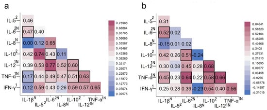 Heatmaps of Pearson’s correlation coefficients in stimulated cytokine responses. (a) PHA-stimulated CBMC; (b) PHA stimulation co-cultured with deferoxamine. Red boxes indicate positive correlations, blue boxes negative correlations; darker color hues reflect stronger relationships. Vertical column, right, is numerical scale for color code. Highlighted black boxes indicate correlations strengthened after iron chelation with deferoxamine. Superscripts: 1 indicates Th1 and 2 indicates Th2 categorization of cytokines; N indicates proinflammatory cytokines in NFκβ family. Abbreviations: PHA, phytohemagglutinin; CBMC, cord blood mononuclear cell; IL, interleukin; TNF-α, tumor necrosis factor alpha; IFN-γ, interferon gamma.