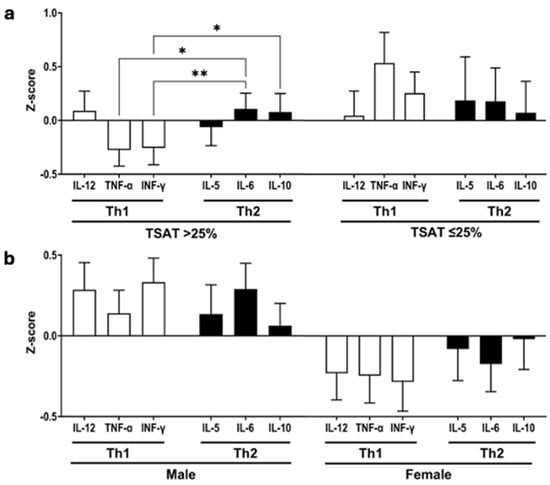 Because absolute levels of cytokines differ, the concentration values were converted to Z-scores to compare the cytokine profiles from each neonate’s samples. Three cytokines representative of Th1 and Th2 cytokine polarization in the cell supernatants were compared between the IS and congenital ID conditions, as shown in Figure 2a. Stimulated CBMCs from the IS neonates released higher IL-6- and IL-10-response (Th2 cytokines) Z-scores relative to their TNF-α and INF-γ responses (Th1 cytokines): * p < 0.05, ** p < 0.01. IS neonates with TSAT > 25th percentile expressed a negative ranking for stimulated TNF-α and IFN-γ (Th1) responses and positive for IL-6 and IL-10 (Th2) responses, but congenital ID (TSAT ≤25th percentile) did not manifest an overt bias for a predominance of Th2 cytokine responses. However, neonates with congenital ID were more likely to evince positive stimulated TNF-α Z-scores. Comparing by sex found no difference between Th1 and Th2 cytokine responses, but the mean Z-scores for both Th1 and Th2 cytokine responses differed in their pattern with positive values for males and, conversely, negative for females, as shown in Figure 2b.