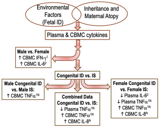 Conceptual diagram describing findings. Environmental factors such as congenital ID in left oval overlap with inheritance and maternal atopy factors in right oval to impact plasma and stimulated CBMC cytokines. Biological sex itself impacted stimulated CBMC responses, middle left. In congenital ID vs. IS (bottom), significant male stimulated CBMC response are represented on the left, significant plasma and stimulated CBMC responses with both sexes combined are represented in the center, and significant female congenital ID plasma cytokines and stimulated CBMC responses are represented on the right. Arrows, direction of cytokine; 1, Th1 cytokines; 2, Th2 cytokines; N, the nuclear factor-κβ (NF-κβ)-dependent family member.