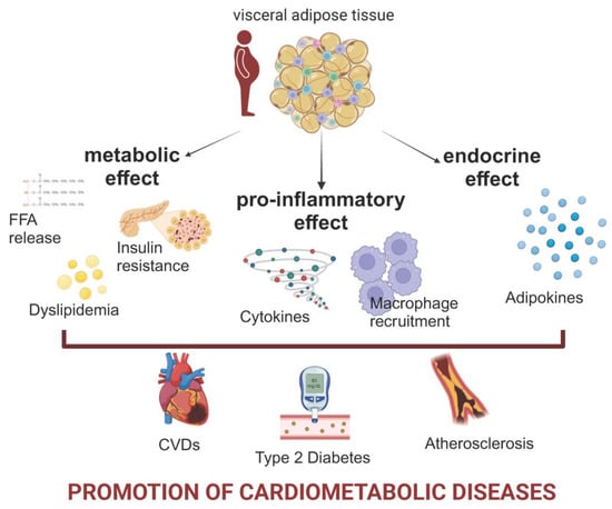 Indeed, visceral AT (VAT) contributes to metabolic and cardiovascular diseases by promoting metabolic dysfunction, insulin resistance, and systemic inflammation (Figure 1) []. VAT is made up of large, insulin-resistant adipocytes that lead to excessive lipolysis, releasing free fatty acids (FFAs) into the liver, disrupting lipid and glucose metabolism, and contributing to hyperinsulinemia and type 2 diabetes []. VAT also contains a higher density of hormone receptors like glucocorticoid and androgen receptors, which cause VAT to increase with age, especially in men []. Additionally, VAT acts as an endocrine organ, secreting adipokines such as leptin, adiponectin, omentin, resistin, and visfatin, which regulate metabolism [,]. In obesity, these adipokines become dysregulated, with the quantities of beneficial ones like adiponectin being decreased and those of harmful ones like resistin being increased, further worsening insulin resistance and metabolic disorders.