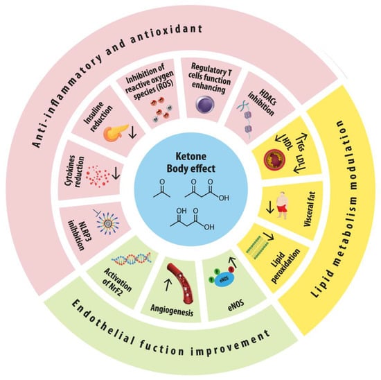 Notably, the KD has been shown to improve the blood lipid profile, often outperforming other diets, and displays significant anti-inflammatory and thus cardioprotective properties. The state of ketosis reduces inflammation through the elimination of simple sugars, carbohydrate restriction, and omega-3 fatty acid supplementation. Ketone bodies (i.e., beta-hydroxybutyrate (BHB), acetoacetate, and acetone) also serve as “rescue fuel” for the compromised heart, positively influencing its metabolism. Moreover, the ketogenic diet enhances endothelial function and helps prevent vascular aging, and it has favorable effects on blood pressure and other CVD risk factors, partly due to weight reduction [].