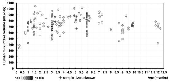 Human milk intake volume (mL/day) at different postnatal ages (months) during the first year of life of exclusively and non-exclusively breastfed infants. Markers represent individual cohorts at the measurement periods, where darker circles correspond to larger sample sizes (minimum n = 1/maximum n = 160). Where no information on the sample sizes is known, these are depicted as crosses.