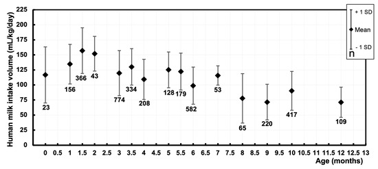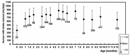 Pooled mean human milk intake volume (mL/day) at different postnatal ages (months) during the first year of life of exclusively and non-exclusively breastfed infants. Markers represent the pooled mean human milk intake volume and the range of estimated standard deviations at the respective postnatal age. Sample sizes are depicted under the markers.
