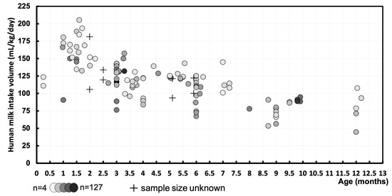 Human milk intake volume (mL/kg/day) at different postnatal ages (months) during the first year of life of exclusively and non-exclusively breastfed infants. Markers represent individual cohorts at the measurement periods, where darker circles correspond to larger sample sizes (minimum n = 4/maximum n = 127). Where no information on the sample sizes is known, these are depicted as crosses.