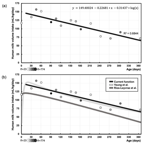 (a) The current function of pooled mean human milk intake volume (mL/kg/day) at different postnatal ages in days, with the corresponding formula and R-squared value. Circle markers represent the pooled means, with darker circles corresponding to larger sample sizes (minimum n = 23, maximum n = 774). (b) The current function, next to the functions by Yeung et al. and Rios-Leyvraz et al. [7,15].